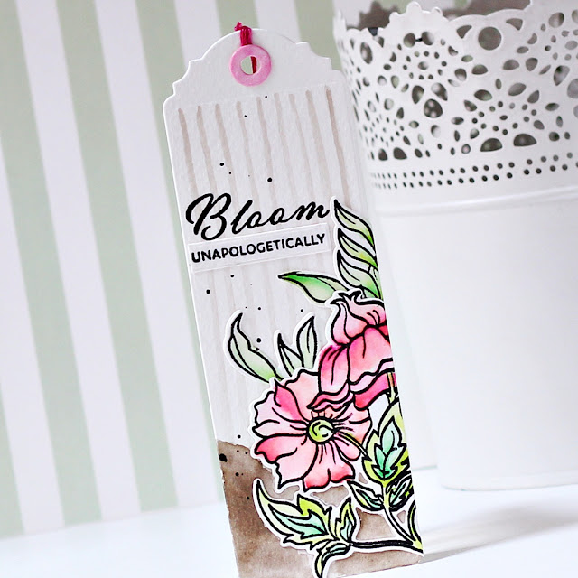 Next, I used a very fine paint brush to paint some loose pale grey stripes on the bookmark using Industrial Diamond paint. After this dried, I sprinkled some black paint splatters around by tapping my brush onto my paper. I also added some sketchy sand to the bottom with the Watercolor 36 Pan Set and blended it out a bit with water. Next, I stamped the floral images from the Rosy Blooms Stamp Set using Obsidian Ink onto Neenah Classic Crest Solar White Cardstock. I then coloured the images using the Watercolor 36 Pan Set and cut them out with the coordinating dies.