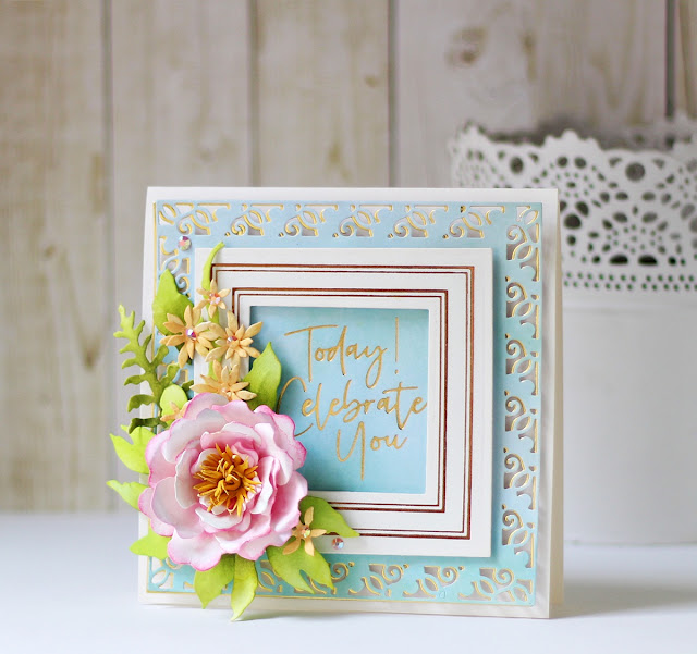 Next, I applied Glimmer Hot Foil Roll - Gold to a piece of patterned paper using the For You Glimmer Hot Foil Plate Set. I then die cut it out using a past Large Die of the Month Set - Floral Lace Frame. This is a stunning die set, but sadly is not available at present in the Spellbinders shop. You can, however, use any frame die that you have in your stash for your cards. I also die cut it out of Gold Mirror Cardstock to to give the frame a golden shadow. I slightly offset it before adhering to the back of the foiled die-cut in order to give an illusion of depth.